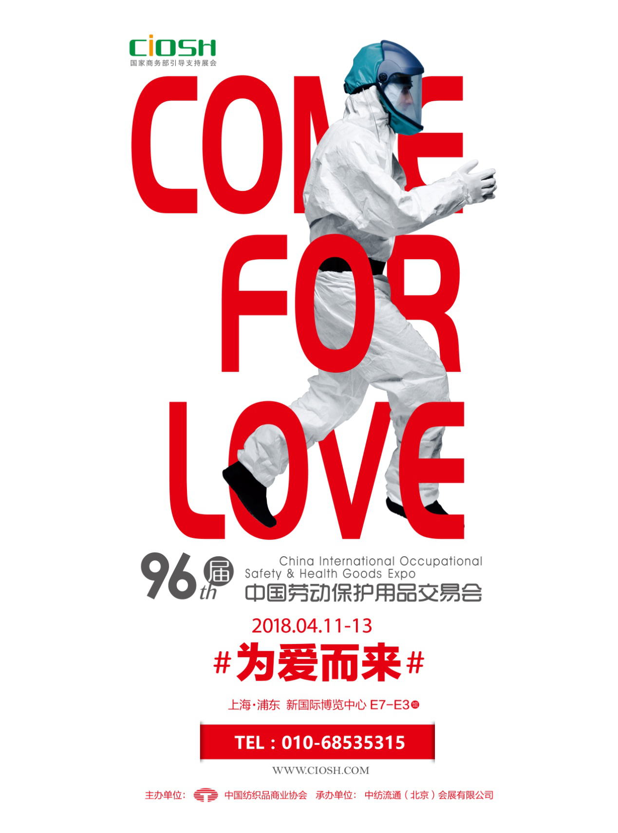 CIOSH——中国劳动保护用品交易会是由中华人民共和国商务部重点支持、中国纺织品商业协会主办的国家级专业展会。2018年4月11日,以“为爱而来”为主题的第96届中国劳动保护用品交易会(以下简称“劳保会”)将盛放上海浦东,打响新年劳保行业汇聚交流第一炮。