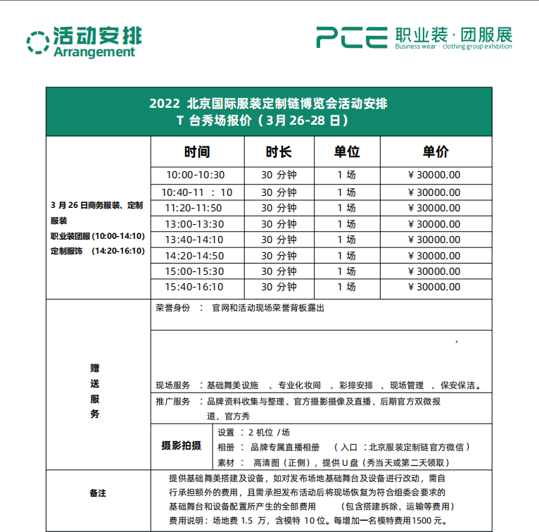 服装T台秀一直都是人潮中曝光度的最高处,展会中的模特走秀更将是企业和观众永远的靓点。北京展,PCE组委会将联合优秀职业装、工装、冲锋衣、特种服饰、制服等行业代表企业上演多场引爆全场的时尚T台秀。同样也是企业提升品牌形象最佳平台之一,目前职业装主打绿色设计+和互联网+双加驱动的核心战略,感兴趣的企业请详询组委会工作人员:13661141329