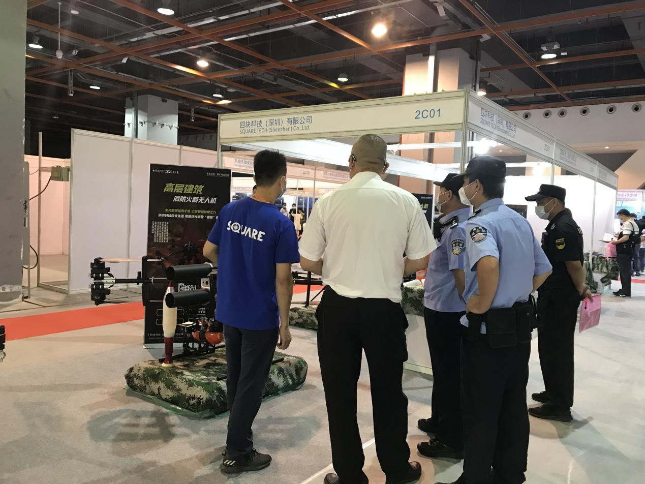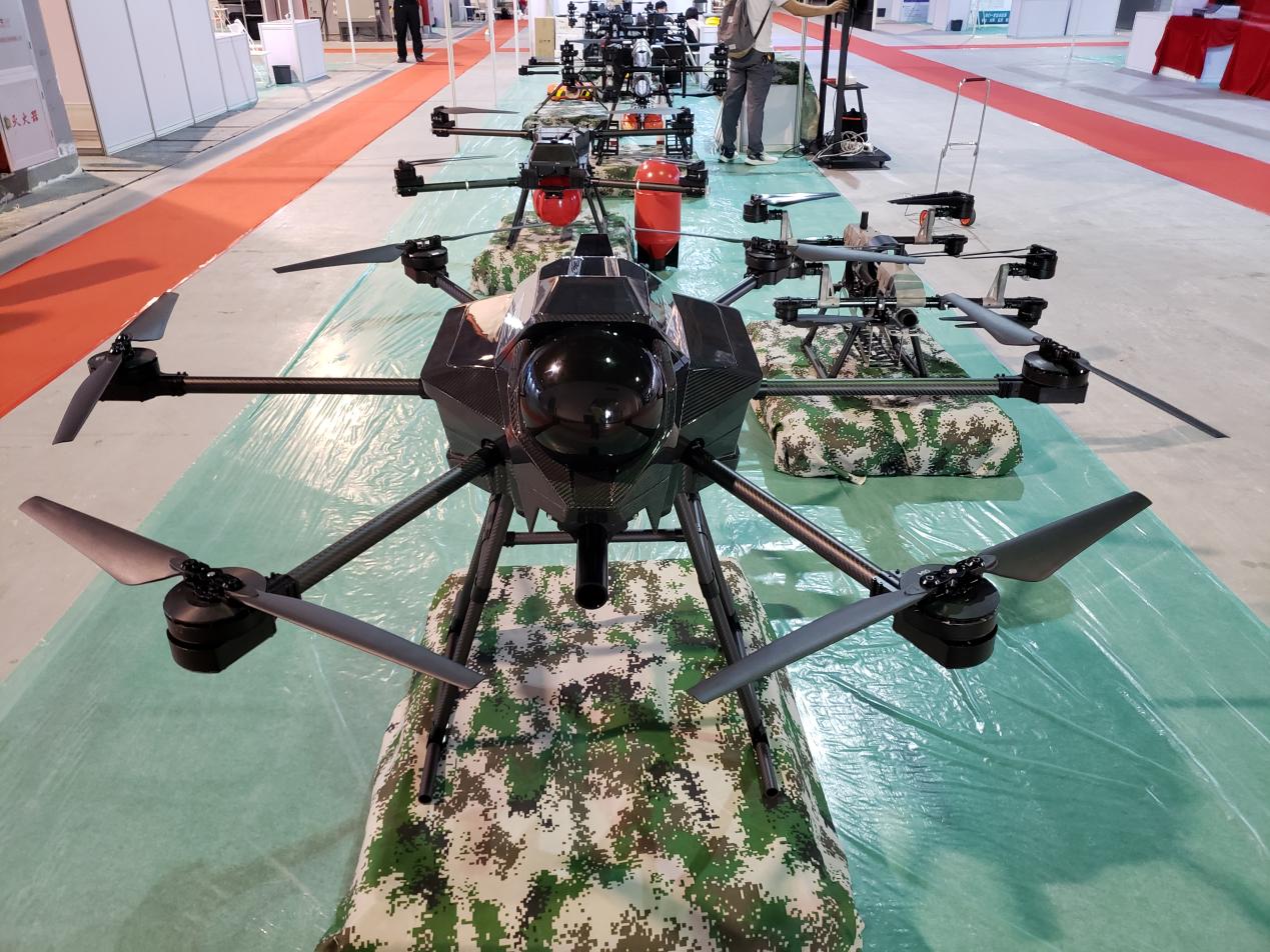四块科技展出察打无人机、水上救援无人机、消防火箭无人机、森林消防无人机、单兵背负式无人机、特种作战飞榴无人机等精彩亮相。察打无人机可以发射40MM、35MM、38MM制式枪榴弹,发射38MM催泪弹能打出特殊的直角弹道,弹丸发射后可空中制动并垂直下落,打击建筑物背后的目标,特别适合用于城市环境使用。高层建筑消防灭火无人机,起飞重量45公斤,飞行时间20分钟,弹种是100MM消防弹,抗风等级8级。