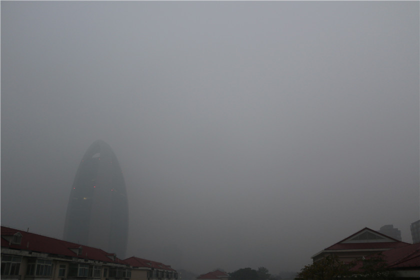 天津天空被“面纱”笼罩,远处的楼房“若隐若现”。
