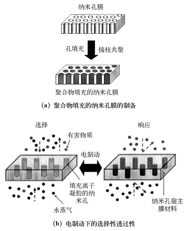 除此之外,通过接枝离子凝胶制备的电制动纳米多孔聚合物膜在生化防护服上也显示出巨大的应用潜力,在施加和取消电场的作用下,由于位于纳米孔内的离子凝胶膨胀和收缩,从而可根据需要调节孔径,提高透气性。