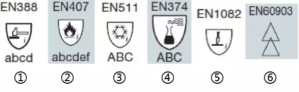 标志下方的abcdef分别对应阻燃,防接触热,防对流热,防辐射热,防小金属溶液飞溅,防大金属溶液飞溅。