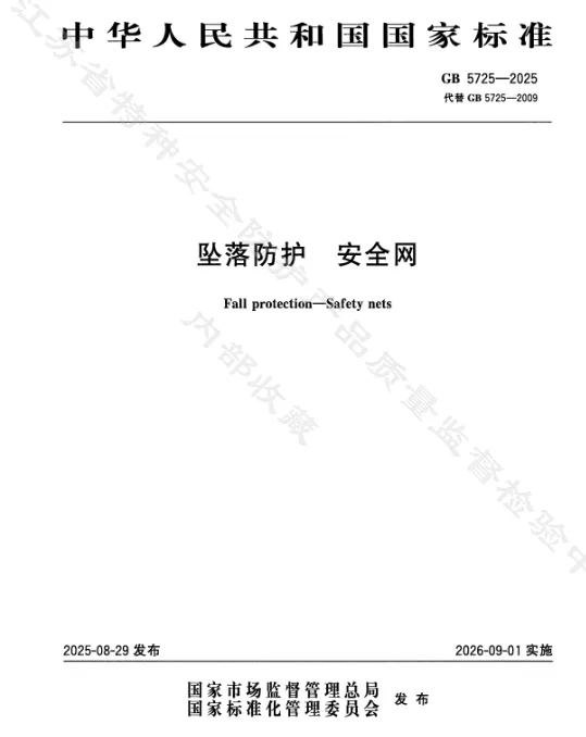 重要提醒:标准更新在即!现行安全网国家标准 GB 5725-2009《安全网》即将于2026-09-01作废,由2025年8 月29日发布的新标 GB 5725-2025《坠落防护 安全网》替代,新标将于2026年9月1日起实施。新标在分类标记、结构设计、静态强度、耐冲击与贯穿性能等核心要求上均有重大调整,更贴合当前安全防护需求,涉及生产、销售、施工使用等全链条的相关单位,需提前关注标准变化、完成产品升级与合规适配,确保2026年9月1日后所涉安全网产品完全符合新标要求,严守安全生产底线。