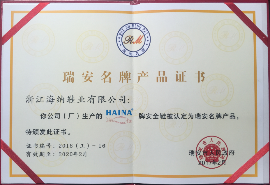 2017年3月5日,浙江海纳鞋业有限公司生产的“HAINA”牌安全鞋被认定为瑞安名牌产品,瑞安市人民政府为浙江海纳颁发了证书及奖牌。