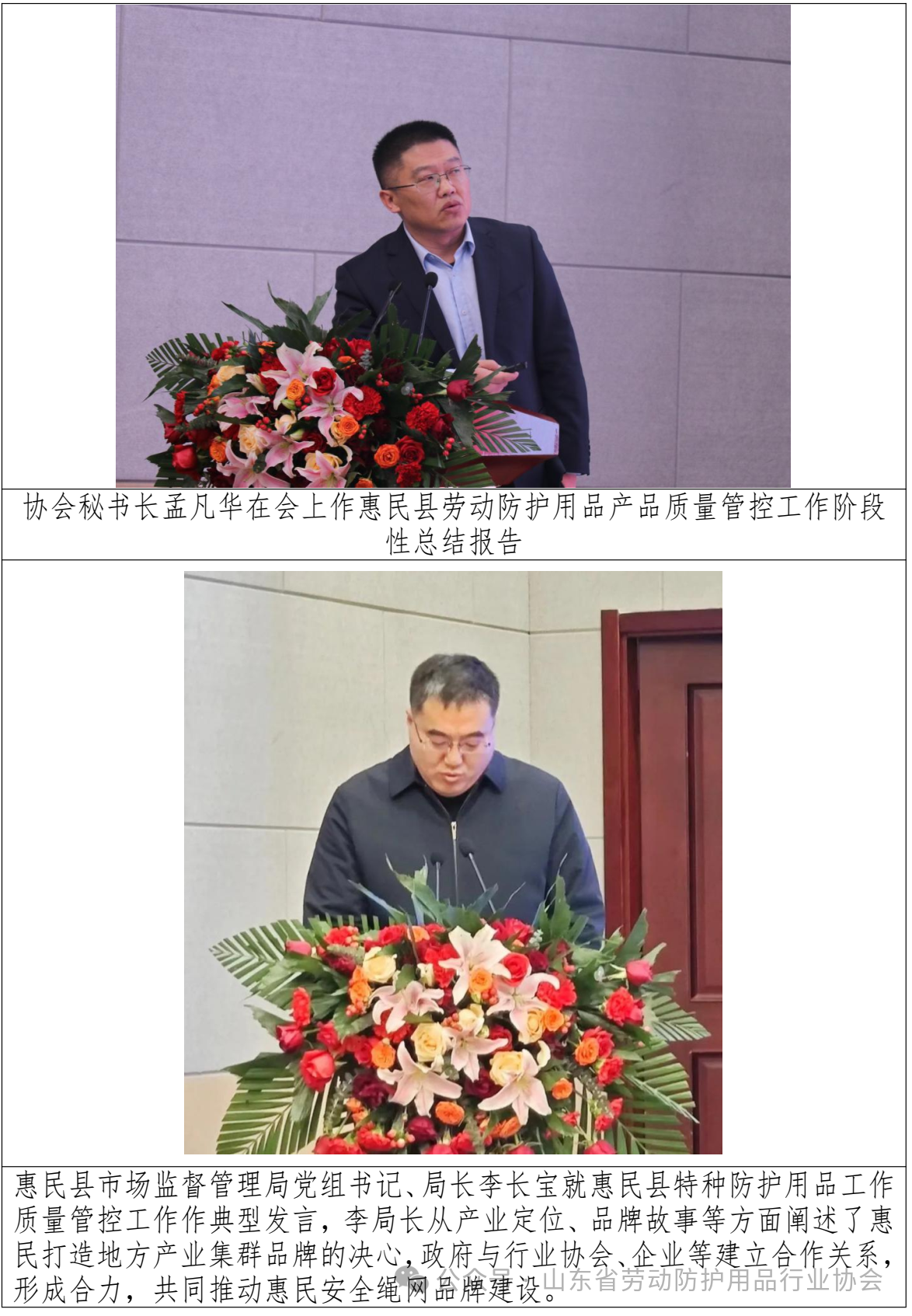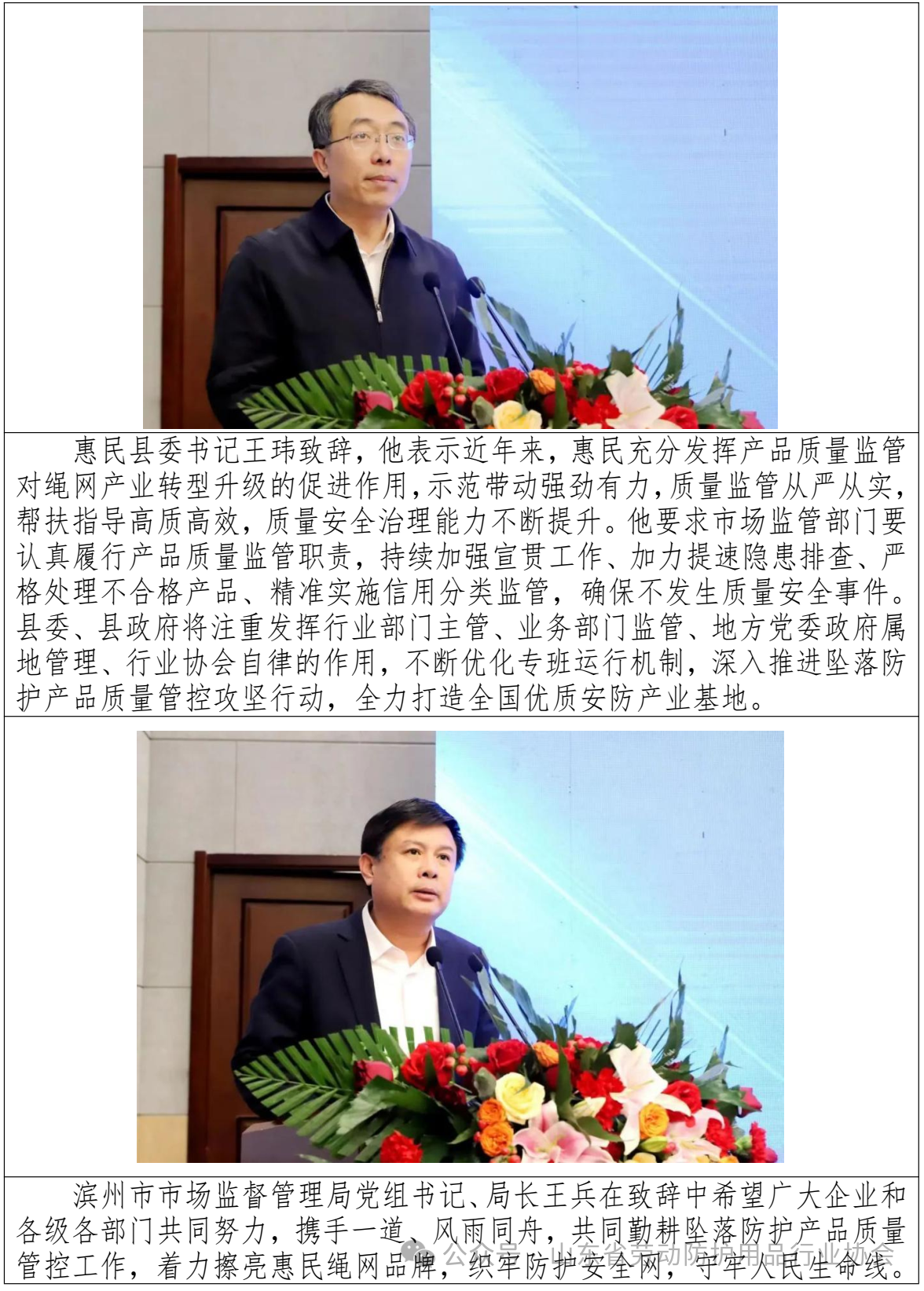 2024年1月25日,由惠民县市场监督管理局和山东省劳动防护用品行业协会共同主办的“山东省坠落防护产品质量管控创新工作及经验交流合作会议”在惠民县召开。旨在总结前期产品质量管控方面所取得的阶段性成果,通过培育达标企业,树立品牌典型,集中多方力量共同打造优质产业基地,带动绳网带产业健康恒稳发展。